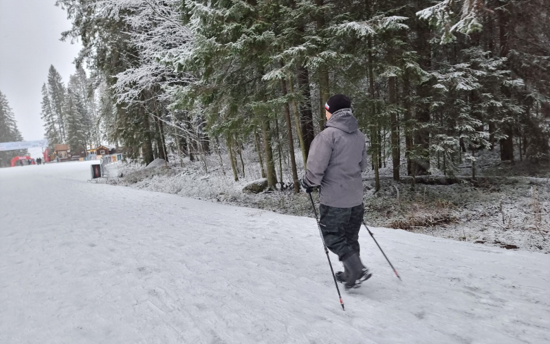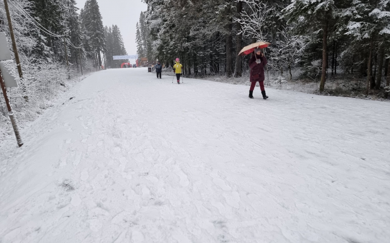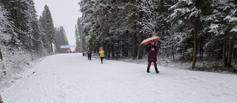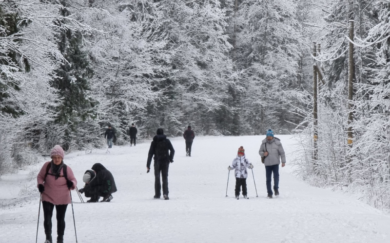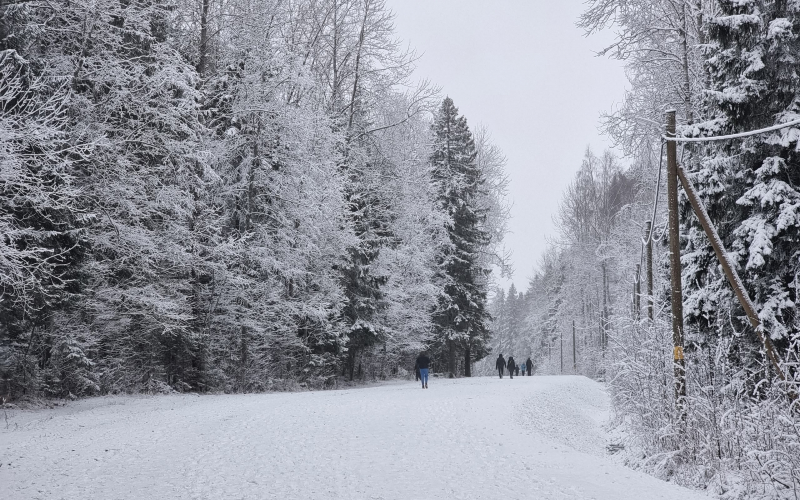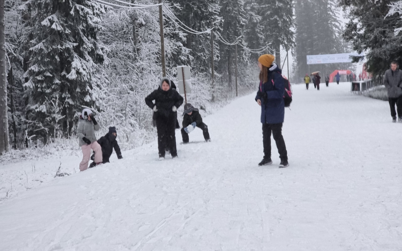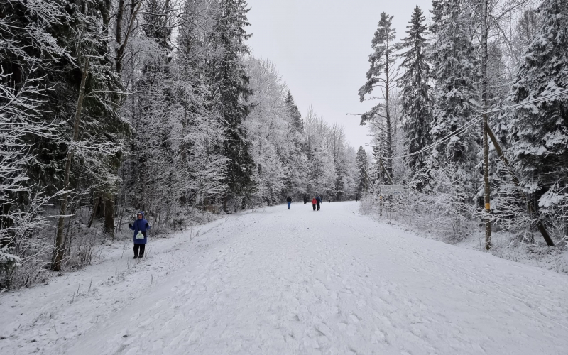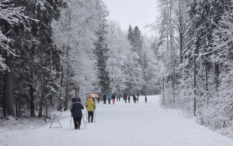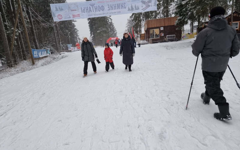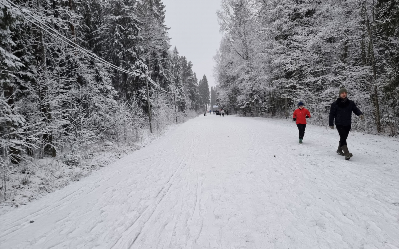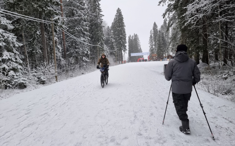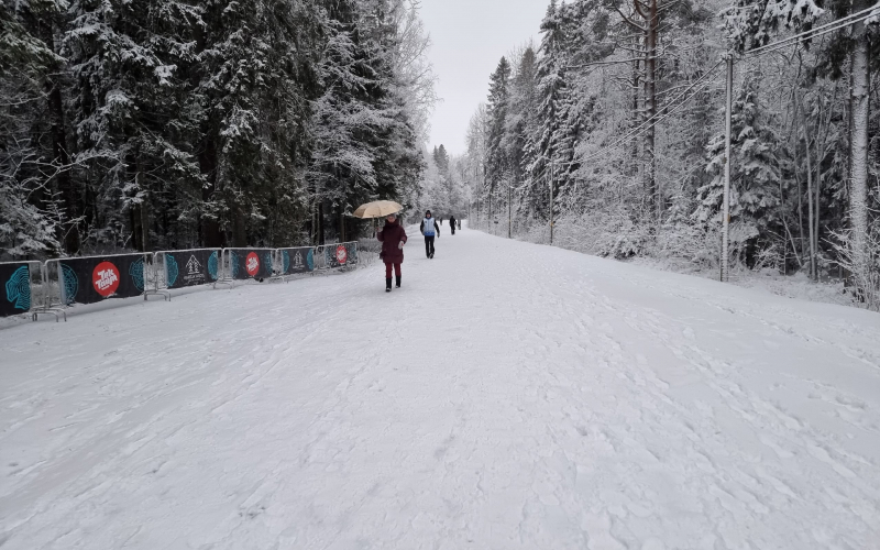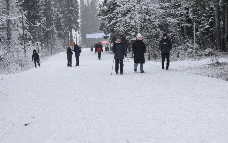 Участники фестиваля вышли на трассу с палками, на велосипедах, под зонтами, с собаками - все любуются зимним лесом и дышат свежим воздухой.