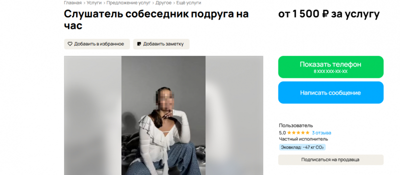 В Петрозаводске предлагают услугу слушателя, собеседника и подруги на час. Ее стоимость начинается от 1,5 тыс. рублей, сообщает портал Авито.