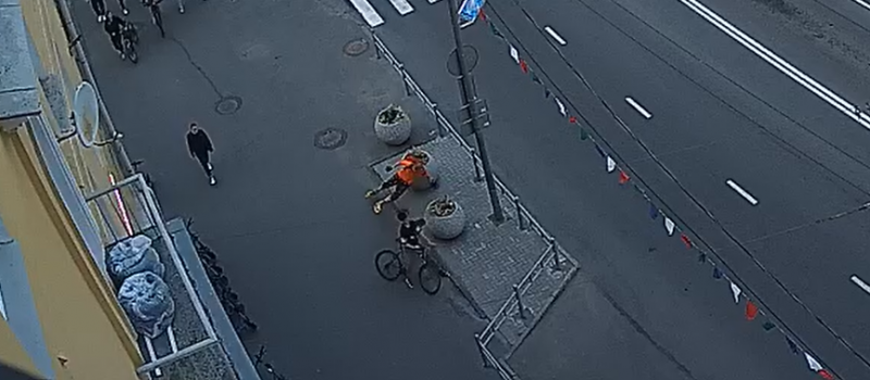 На записи видно, как юноша на велосипеде проехал по пешеходному переходу, после чего на скорости выехал на тротуар и влетел в другого велосипедиста. От удара последний отлетел в сторону и приземлился спиной на клумбу.