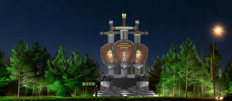 «Въездная стела „Город воинской славы“ состоит из трех мечей, трех щитов и двух пушек. Как рассказывает сам автор, образ композиции — это три богатыря, которые стоят на охране своей Отчизны. Но в то же время композиция ассоциируется и с морской флотилией: низ щитов напоминает носовую часть ладьи, а сами щиты — паруса. Это напоминает о том, что Петрозаводск — город пяти морей», — сообщила Инна Колыхматова.
