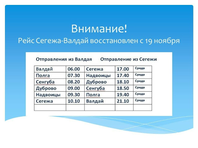 Как сообщили в администрации Сегежского округа, начиная с 19 ноября, автобус по пригородному маршруту № 101 между Сегежей и поселком Валдай будет курсировать каждую среду.