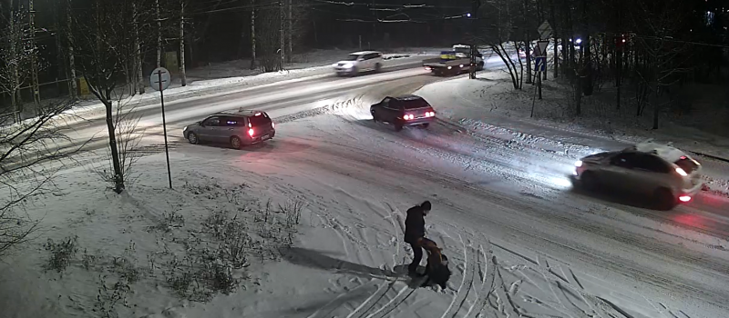 На кадрах видно, как горожанин вместе с собакой переходит дорогу в месте, для этого непредназначенном, а после начинает жестоко ее избивать, пиная ногами. Пес от страха прижался к земле.