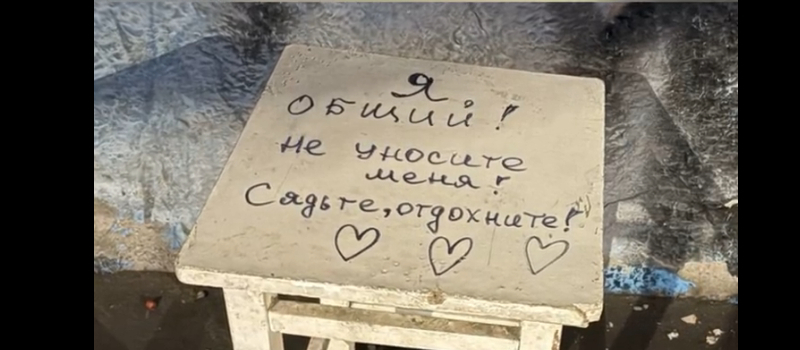 «Народный фронт» на обычной остановке «Рыбокомбинат» в Петрозаводске обнаружил одинокий табурет. Надпись на нем гласила: «Я общий! Не уносите меня, сядьте, отдохните!».