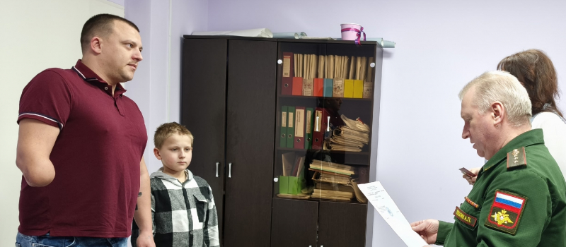 Глава администрации Лоухского района Кристина Серебрякова вместе с военным комиссаром вручили местному жителю Роману Козлова медаль Суворова.