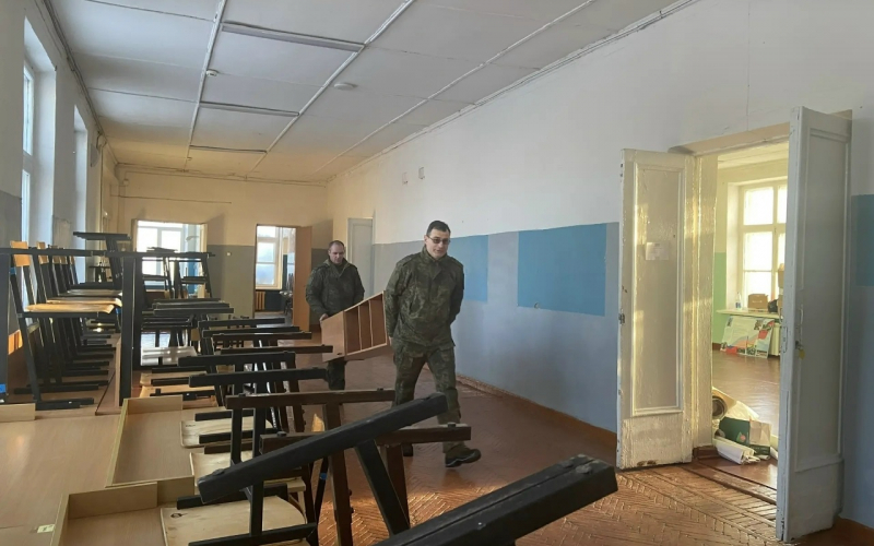 Подужемская школа Кеми начинает капитальный ремонт, родители учащихся и военнослужащие помогли подготовить помещения.